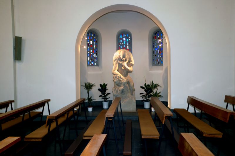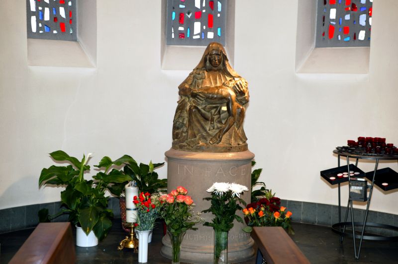 Die linke Seitenkapelle des Langhauses dient der Aufnahme der von Elmar Hillebrand in Bronze gearbeiteten Pieta ("Vesperbild") (1987). Ihr Rundsockel aus italienischem Santa-Fiora-Stein weist hin auf die Opfer des Zweiten Weltkriegs aus der Pfarrei. Für die nähere Gestaltung des ausdrucksvollen Bildwerks hat sich der Künstler durch die Pieta eines süddeutschen Wallfahrtsortes anregen lassen. In der Rückenaushöhlung der Figur sind Kreuzigung und Grablegung Jesu dargestellt.