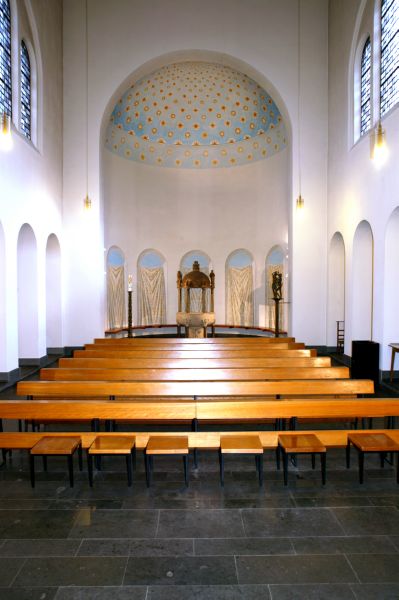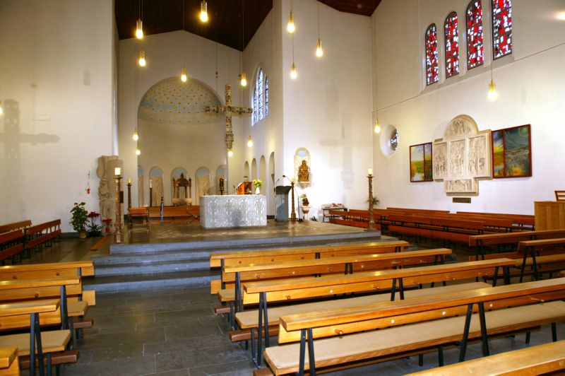 Dieser Ausrichtung entsprechend wurde der vordere Triumphbogen abgetragen, um den früheren Vorchor stärker in das neue Raumgefüge einzubinden. Die im Vorchor vorhandenen Seitenarkaden wurden in vereinfachter Form neu errichtet, um dem Monumentalcharakter des Raumbildes besser zu entsprechen. Gleichzeitig wurden die Fenster der Chorrundung geschlossen. An die Stelle des bisherigen Rippengewölbes. das im Langhaus auf Wandpilastern ruhte und durch Gurtbögen eingeteilt war, trat eine zeltartig wirkende Holzdecke, die das Langhaus, den Vierungsbereich und das ehemalige Vorchor zusammenschließt. In der Mitte des kreuzförmigen Grundrisses entstand eine erhöhte Altarinsel als Sinnmitte des Raumes. Nach dem Wunsch von Bischof Leo Lommel (1956-1971), der regelmäßig an der Baustelle weilte, sollte die St. HeinrichKirche das erste Luxemburger Gotteshaus werden, in welchem der Altar in der Mitte der liturgischen Gemeinschaft errichtet ist. Diesem Anliegen entspricht auch das leichte Gefälle des Raumes von der Eingangszone zum Altarbezirk hin. In der Eingangszone wurde die Sängerempore entfernt, um die Weiträumigkeit nicht zu beeinträchtigen.