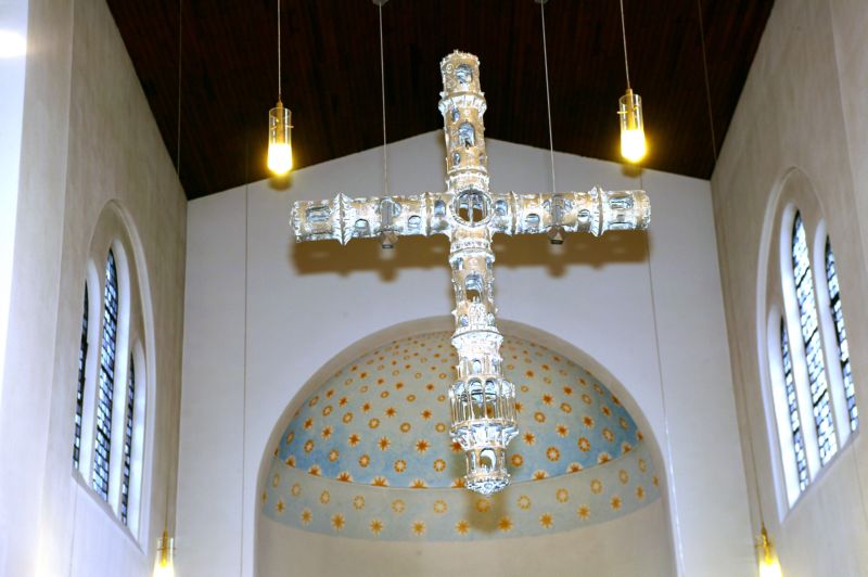 Seit 1968 wird der Altarblock optisch hervorgehoben dt das monumentale, aus Bronze gegossene Hängekreuz Elmar Hillebrand. Ähnlich wie im Dom von Speyer erinnert in seiner näheren Gestaltung an einen Turm in Kreuzesform der - wie ein reiches Architekturgebilde - von innen in se Hohlräumen begehbar erscheint. So war es möglich, in seinen Balkenöffnungen neutestamentliche Geschehen anhand von zahlreichen und lebhaft gestalteten Statuetten unterzubringen. Es handelt sich im Einzelnen um die Geburt Jesu, das Abendmahl, die Geißelung, Kreuzesbetrachter, die Kreuzigung, die Kreuzabnahme, die Engel und Frauen am Grab sowie um die Himmelfahrt. Somit sind all diese Ereignisse aus dem Leben Jesu letztlich auf das Kreuz ausgerichtet und finden in dem Kreuz ihre Sinngebung.
