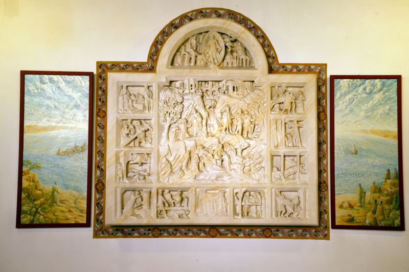 Der Ambo (1982) zeigt in leichtem Relief das Blattzweigmotiv. Das Pult selbst über der Stele, in Bronzeguss ausgeführt, inspiriert sich in seiner näheren Gestaltung am Motiv des geöffneten Buches, in welchem sich das Wort der göttlichen Offenbarung mitteilt.