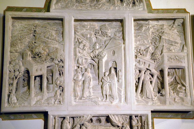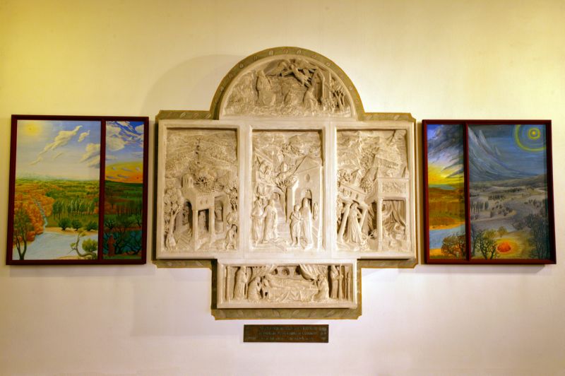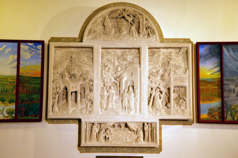 Erst nach längerem Zeitabstand ist in einer zweiten Phase zu Beginn der 80er Jahre die künstlerische Raumausstattung weitergeführt worden. Zu nennen sind an erster Stelle die von Elmar Hillebrand in Stein gemeißelten Wandtafeln in den beiden leicht hervorspringenden Querhausflügeln. Ihr Aufbau ist bestimmt von einer triptychonähnlichen dreiteiligen Komposition, die an spätmittelalterliche Altaraufbauten erinnert. Im rechten Querhausflügel erzählt in ansprechender und volkstümlicher Formensprache die „Franziskustafel'', die in Savonieres-Stein gehauen und von einem bemalten Rahmen umgeben ist, in mehreren Nischen die wichtigsten Ereignisse aus dem Leben des hl. Franz von Assisi. Sie sind jeweils in Aufbau und Einzelheiten inspiriert an den Freskomalereien Giottos in der Oberkirche von Assisi. Das obere abschließende Segmentrelief hat als Bildthema die Stigmatisierung des Heiligen auf dem Berg Alverno im Jahre 1224. Die untere Szene illustriert seine Sterbestunde, den sog. „Transitus" (Übergang) des Poverello, 1226 in Portiuncula. Die beiden Seitentafeln, als Malereikompositionen konzipiert, gehen auf Klemens Hillebrand zurück. Im Sinne der franziskanischen Spiritualität haben sie als Bildthema die vier Jahreszeiten vor dem Hintergrund der Landschaft Umbriens, in der Franziskus beheimatet war. Angedeutet ist deshalb auch seine Gestalt innerhalb der Komposition. Unter der „Franziskustafel" erinnert eine bronzene Schrifttafel an das Wirken der Franziskaner von 1923 bis 1959 in der Pfarrei.