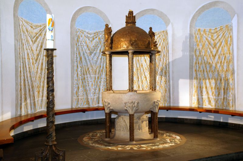 Hinter dem Altarbereich, in der früheren Chorrundung. ist 1989 ein monumentales Taufbecken von Elmar Hillebrand aufgestellt worden. Das eigentliche Becken, von Säulen getragen, ist in Santa-Fiora-Stein gemeißelt. Es wird überragt von einer Barockkuppel. die auf sechs, mit Rankenwerk ornamentierten Säulen ruht. Die überreiche Symbolik am Becken, seinem Sockel sowie auf der Kuppel beleuchtet mit aus der Heilsgeschichte stammenden Ereignissen das Taufgeschehen. In der Sockelzone des Beckens wird die Bedeutung des Wassermotivs durch vier Szenen konkretisiert: durch den Gekreuzigten und seine geöffnete Seite, den Durchzug durch das Rote Meer, durch Mose, der in der Wüste Wasser aus dem Fels schlägt, sowie die Taufe Jesu im Jordan. Die großen Stehfiguren auf der Kuppel weisen hin auf Johannes den Täufer und Maria als Urbild der Kirche, die aus der Taufe geboren wird. Auf dem unteren Rand der Kuppel sitzen in voll plastischer Gestaltung die vier Evangelisten als Zeugen der Auferstehung Christi, in welcher die Taufe gründet, während die Kuppelschale in leichtem Relief die zwölf Apostelköpfe zeigt. Die Kuppel wird bekrönt durch die Darstellung des Himmlischen Jerusalem, in dessen Mitte das Lamm als Zeichen des siegreichen Christus erscheint. Im Innern der Kuppel schwebt die in Alabaster gestaltete Hl. Geist-Taube, ein Werk von Clara Hillebrand. Ein lebhaft wirkendes Marmorintarsienband mit dem Fischmuster, das von Johannes Hillebrand ausgeführt wurde, umrundet das Taufbecken.