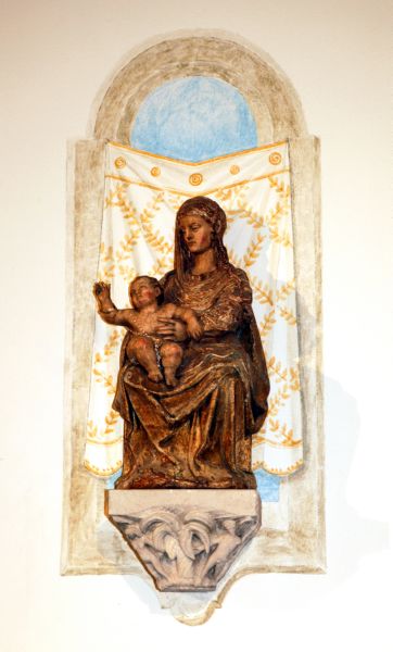 Der Pieta gegenüber ist seit dem Jahre 2001 in der rechten Seitenkapelle die Monumentalstatue des Guten Hirten aufgestellt. In Zusammenarbeit mit seinem Sohn Johannes hat Elmar Hillebrand Christus, den Guten Hirten, auf eine durchaus unkonventionelle Weise dargestellt. Das in Santa-Fiora-Stein gehauene vollplastische Standbild entspricht nämlich nicht dem Bildtyp der altchristlichen Kunst noch demjenigen des Barock oder des 19. Jahrhunderts. Die kräftige und sich bewegende Gestalt des Hirten erinnert eher an Skulpturen von Michelangelo. Der Hirt ist kahlköpfig, expressionistische Gesichtszüge und die starke Hand bestimmen seine Gestalt, die auf die Schriftstelle von Jesaja 40,11 hinweist: "Wie ein Hirt führt er seine Herde, er sammelt sie mit starker Hand". Demgegenüber sind die Schafe zu Füßen des Herrn in einer eher naturalistischen Formensprache gemeißelt, sie wenden sich vertrauensvoll zu ihm, es geht um eine gegenseitige Hinwendung. Gegenüber der Tabernakelsäule. am Übergang vom Langhaus zum ehemaligen Chorbereich, ist an der Wand eine frühbarocke, farbig gefasste Marienfigur angebracht. Sie wird durch einen reich dekorierten, illusionistisch konzipierten Rahmen hervorgehoben. Den steinernen Sockel schuf Elmar Hillebrand. Die Statue ist über den Kunsthandel in die Pfarrkirche gekommen.