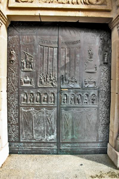 Seit 1994 betritt man die Kirche an der Turmseite durch ein von Elmar Hillebrand kunstvoll gestaltetes Bronzeportal. Das figurenreiche Werk zeigt in den einzelnen Bronzereliefs, die auf den Holzkern aufgelegt sind und mit einer Patina vom Bildhauer an Ort und Stelle der Geschichte des Bundes zwischen Gott und den Menschen Sowohl im Hauptfeld als auch in den Nebenfeldern sind Szenen in eine perspektivische Vertiefung hineingestellt. linken Nebenfeld ist das Kreuzigungsgeschehen dargestellt darunter die Eucharistie als Opfermahl. Das Hauptfeld belebt von der Darstellung des Einzugs Jesu in Jerusalem sowie seiner Auslieferung an Pilatus. Bezeichnenderweise si diese beiden Reliefs hineingestellt in einen kuppelartig Raum, auf dessen Hintergrund die Eisenhüttenwerke der Stadt Esch und die St. Heinrich-Kirche, umgeben von Arbeiterwohnungen, angedeutet sind. Das rechte Nebenfeld illustriert den Gnadenstuhl als Symbol der göttlichen Dreifaltigkeit sowie die Verkündigung des Herrn an Maria in Nazareth, darunter befinden sich die eucharistischen Gaben von Ähren und Trauben. Der obere Abschluss mit den seitlichen Reliefs des heiligen Heinrichs und der heiligen Kunigunde weist hin auf das Himmlische Jerusalem mit seinen Türmen, während unter den neutestamentlichen Szenen Männer- und Frauengestalten aus der Geschichte des Ersten Bundes zwischen Gott und den Menschen auftreten, so links Johannes der Täufer, Rut, Mose, Ester und Elija, rechts Jona, Judit, Hiskija, Debora und David. Die Figurenwelt des Portals ist umrandet von reicher Rankenornamentik, im unteren Teil ist das ebenfalls reich gestaltete Vorhangmotiv angebracht. Es erinnert an den Tempel, worauf auch die lateinische Inschrift Terribilis est laeus iste. Hie est domus Dei et porta coeli hinweist.